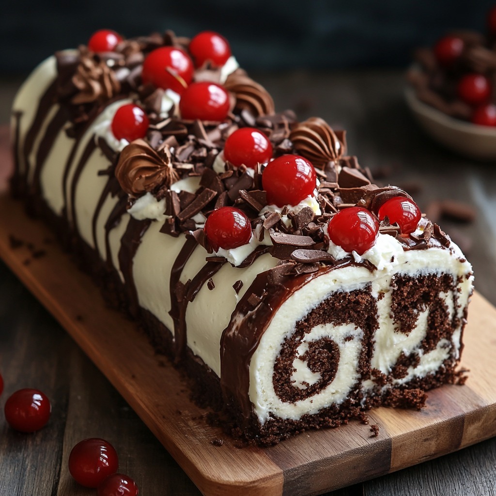 This decadent Black Forest Swiss Roll combines fluffy cocoa sponge cake, rich whipped cream, and sweet cherries, creating a dessert thatâs as visually stunning as it is indulgent. Finished with a dusting of powdered sugar and chocolate shavings, itâs a perfect twist on the classic Black Forest cake, wrapped up into a delightful roll!