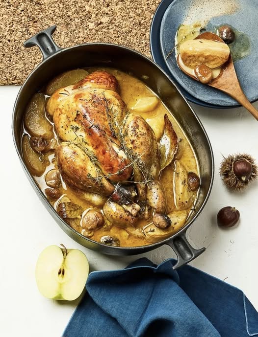 - Retirez-la et réservez. Ajoutez les échalotes, laissez-les dorer quelques minutes. Remettez la pintade dans la cocotte, versez le cidre, les pommes, les châtaignes, le thym et le laurier.