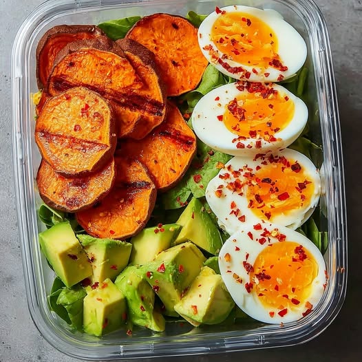 Disposez des patates douces, de l’avocat et des œufs dessus.